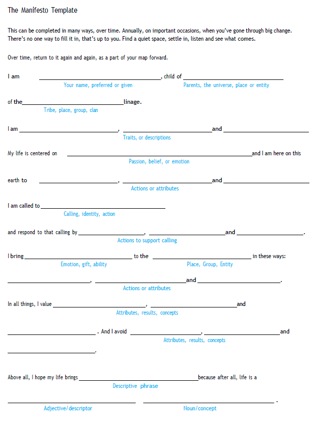 Seeing yourself clearly takes time and space. A simple yet powerful way to do this is by creating a statement about yourself, a personal manifesto. Think of it as a mission statement, of sorts. A starting place on the map of your own transformation. In taking time to ponder this outline and fill in the blanks – in whatever way speaks to you – you may discover parts of yourself you’d forgotten or not yet discovered. Play with it a bit, and see what comes up!